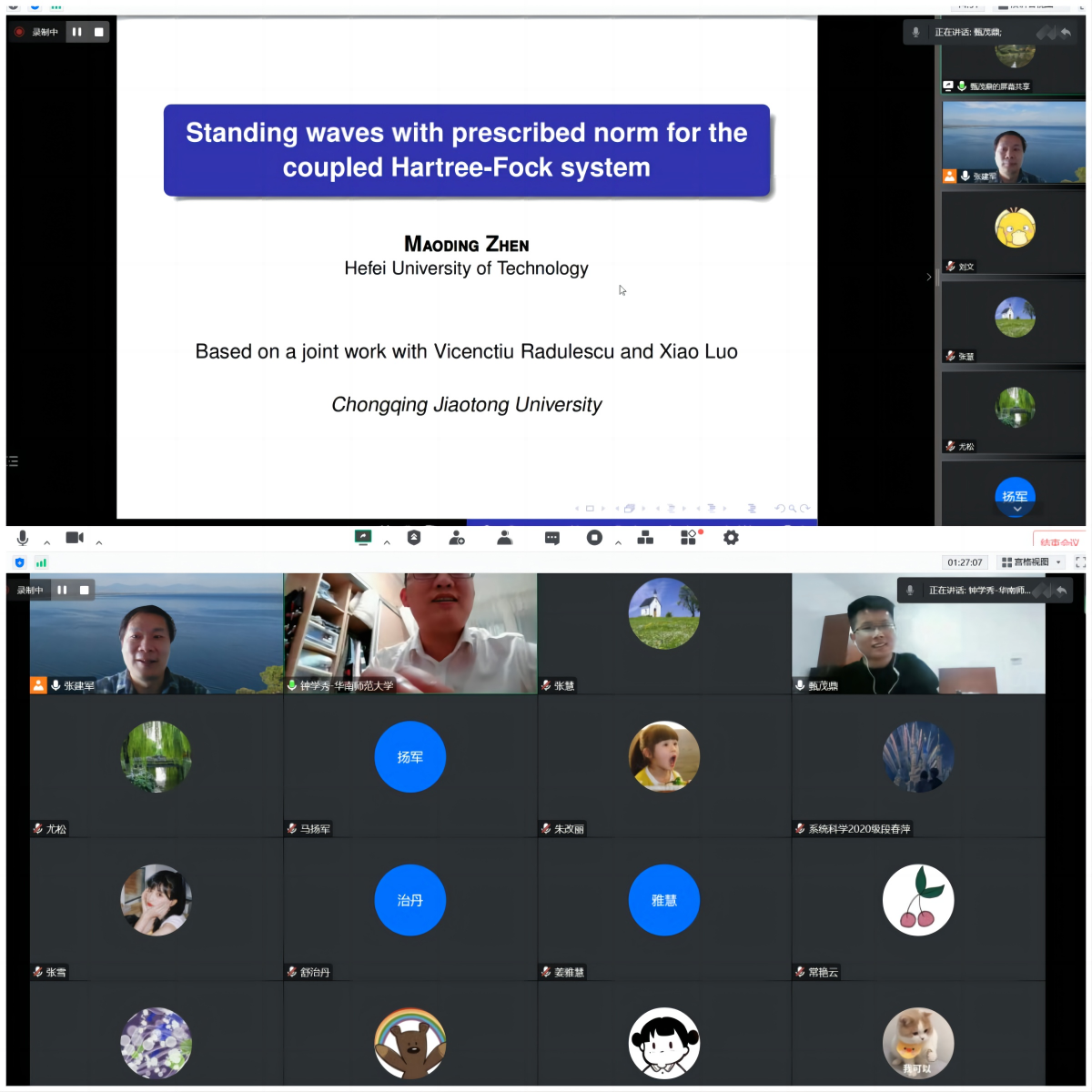 在此次学术活动中,甄茂鼎博士主要报告了其在一类带有非局部项的耦合椭圆系统规范化解方面的研究进展,通过Pohozaev流形和纤维映射方法,研究了质量次临界、质量临界和质量超临界情形下规范化解的存在性,同时,也讨论了解关于参数变化的渐进行为,并指出了该问题的一些公开课题。最后,与大家进行了线上交流研讨,对大家提出的问题进行了解答。