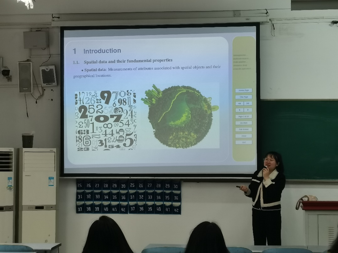 陈凤博士首先对空间数据进行了介绍,指出在计算机网络、地理信息系统以及调查统计等技术快速发展下,可获取的含有地理位置信息的数据越来越多,如何围绕这些空间数据的基本特性,建立相关的回归模型与统计推断方法是空间数据分析领域的热点问题。随后,她从同学们最简单熟知的回归模型入手,通过形象地举例,逐步引导大家思考如何从空间自相关性、空间异质性和空间多尺度性对简单模型进行优化,并介绍如何将空间多尺度纳入空间自回归变系数模型中,建立多尺度空间自回归变系数模型及其估计方法。同学们紧跟思路,兴趣盎然,纷纷表示能够听懂研究的大致思路。陈凤博士告诉大家:科研并没有大家想象中那么难,就是不断发现问题、解决问题的过程。