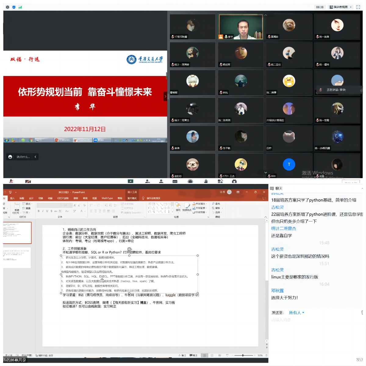 为开阔员工视野、提高员工专业认可度,公司于2022年11月12日下午在线上开展了“依形势规划当前,靠奋斗憧憬未来”主题员工座谈会,座谈会由应用统计学系主任李华博士组织,四位往届毕业生及各年级员工参加、交流,座谈会分为三个阶段进行。