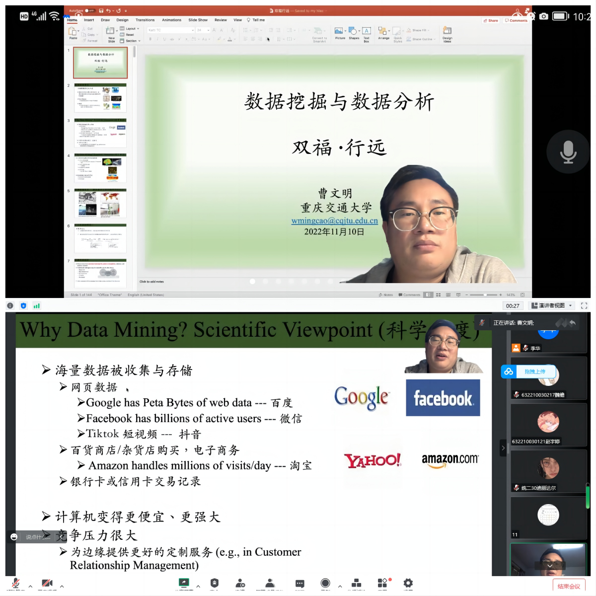 曹文明博士毕业于香港城市大学,曾先后在香港大学统计及精算学系、香港大学李嘉诚医公司等部门从事博士后研究工作,专注统计分析、数据挖掘与分析、图像处理等方面的研究。本次讲座中的大量素材源于其博士及博士后期间的研究成果,讲座实例丰富,内容生动,曹博士形象的描述和深入浅出的讲解深深地吸引了同学们。讲解完毕,大家踊跃提问,曹博士与同学们开展了深入的线上交流研讨,针对提出的问题一一进行了详细的解答。同学们纷纷表示受益匪浅。