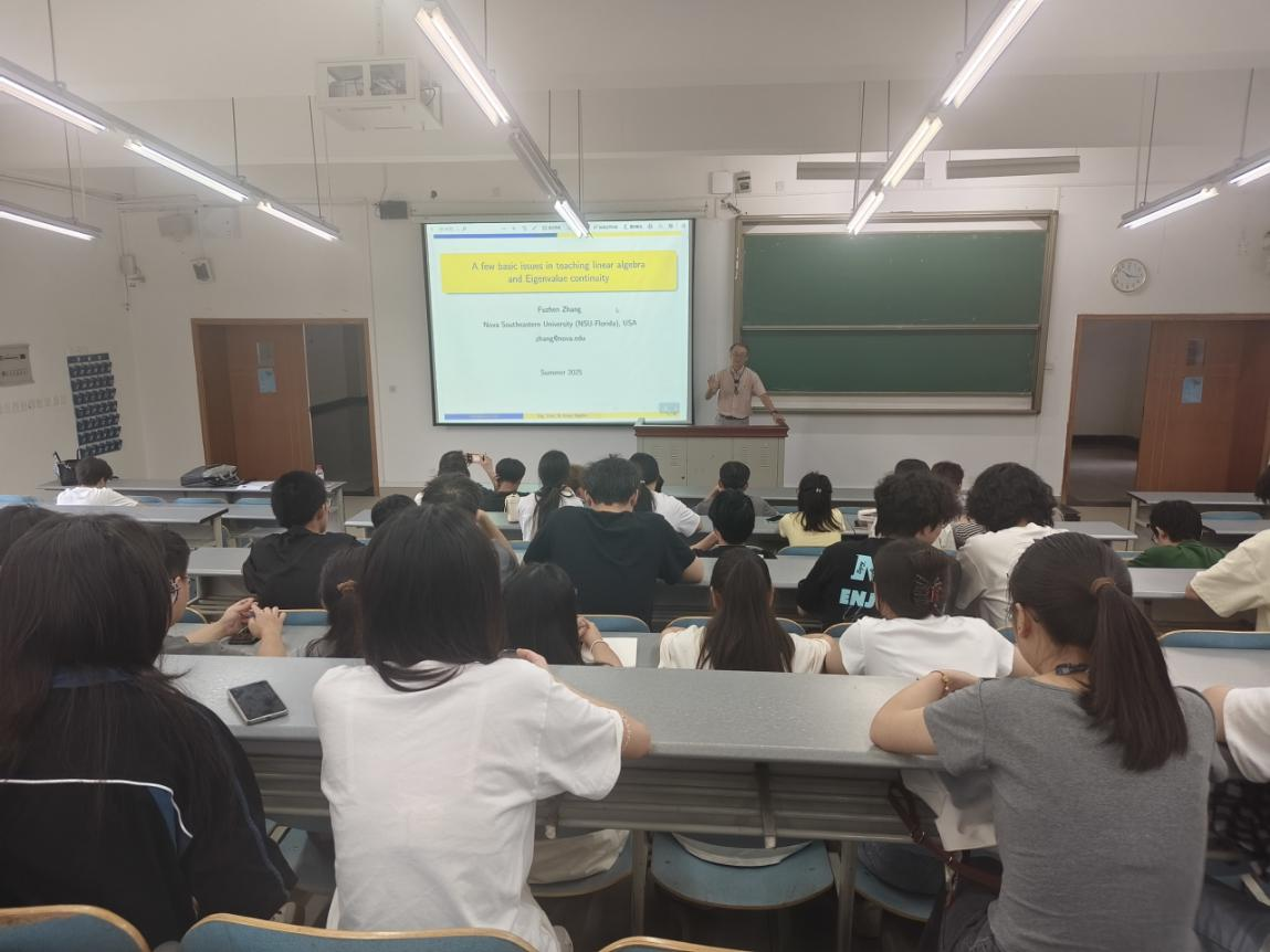 6月26日上午,美国诺瓦东南大学张福振教授应sunbet邀请,以“线性代数核心问题与特征值连续性”为主题,为本科生开展三学期专题授课。《线性代数》课程负责人赵磊娜教授及其团队成员共同参与了这场融合基础理论解析与前沿学术探索的课堂,通过生动案例与跨学科视角,为员工揭开抽象数学概念的本质逻辑。