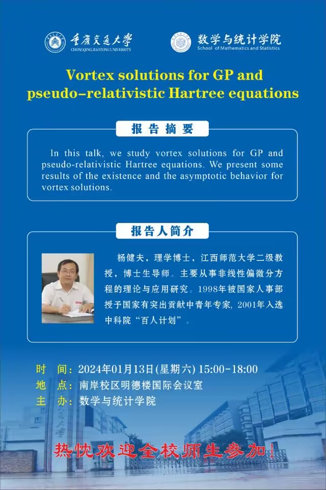 2.15:00-15:50 杨健夫教授做题为《Vortex solutions for GP and pseudo-relativistic Hartree equations》的学术报告。
