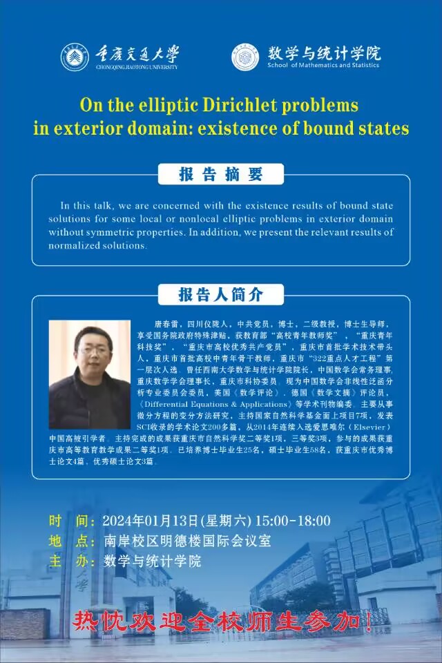 3.15:50-16:40 唐春雷教授(西南大学)做题为《On the elliptic Dirichlet problems in exterior domain: existence of bound states》的学术报告。