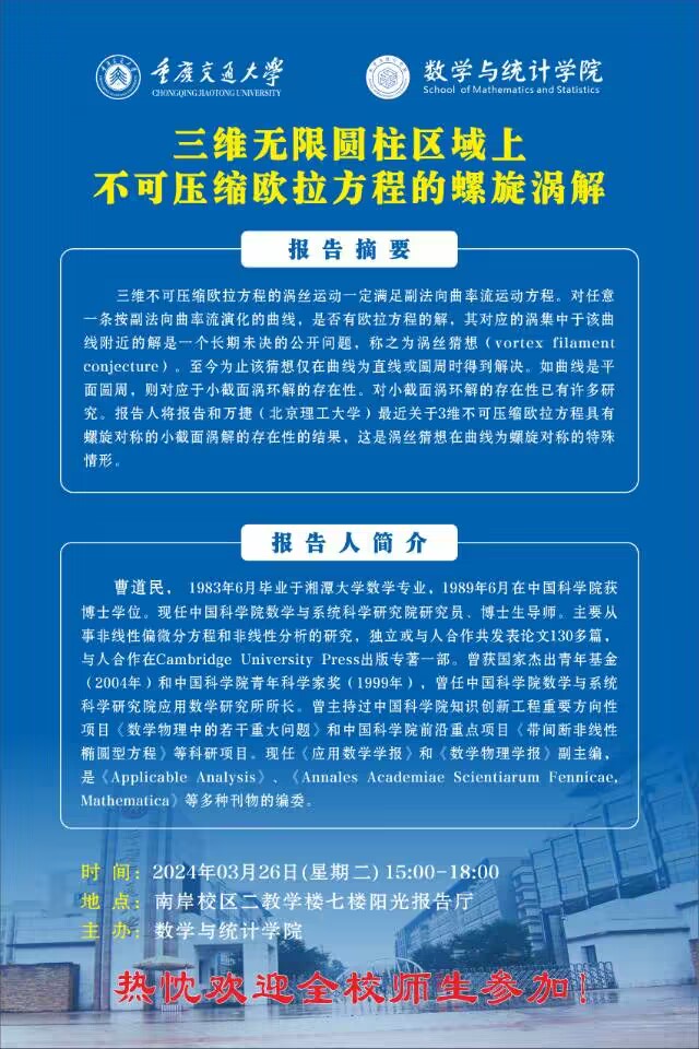 学术报告:三维无限圆柱区域上不可压缩欧拉方程的螺旋涡解