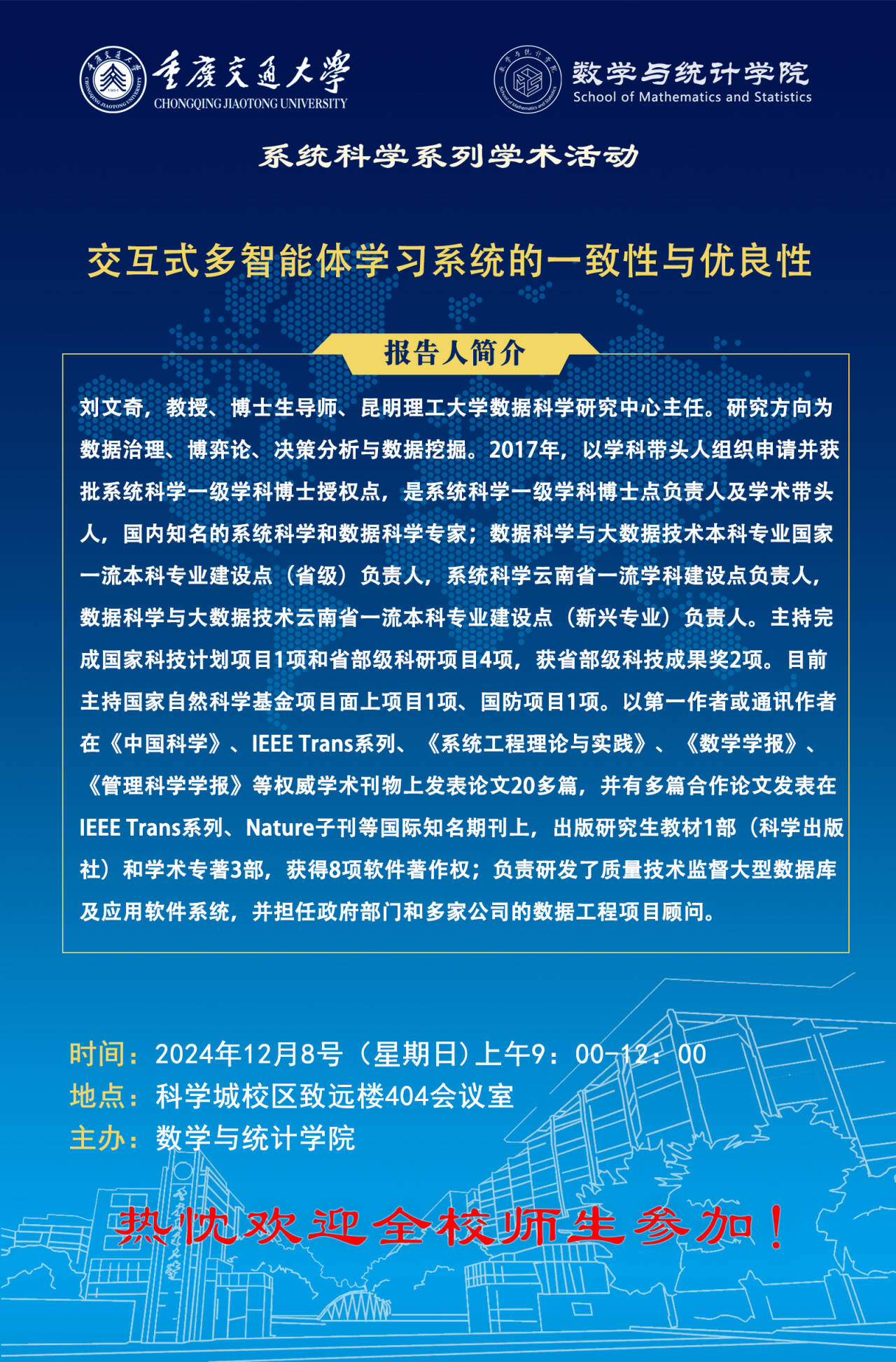 【学术报告】系统科学系列学术活动:交互式多智能体学习系统的一致性与优良性