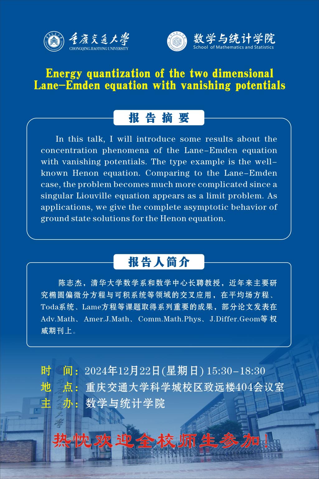 【学术报告】Energy quantization of the two dimensional Lane-Emden equation with vanishing potentials