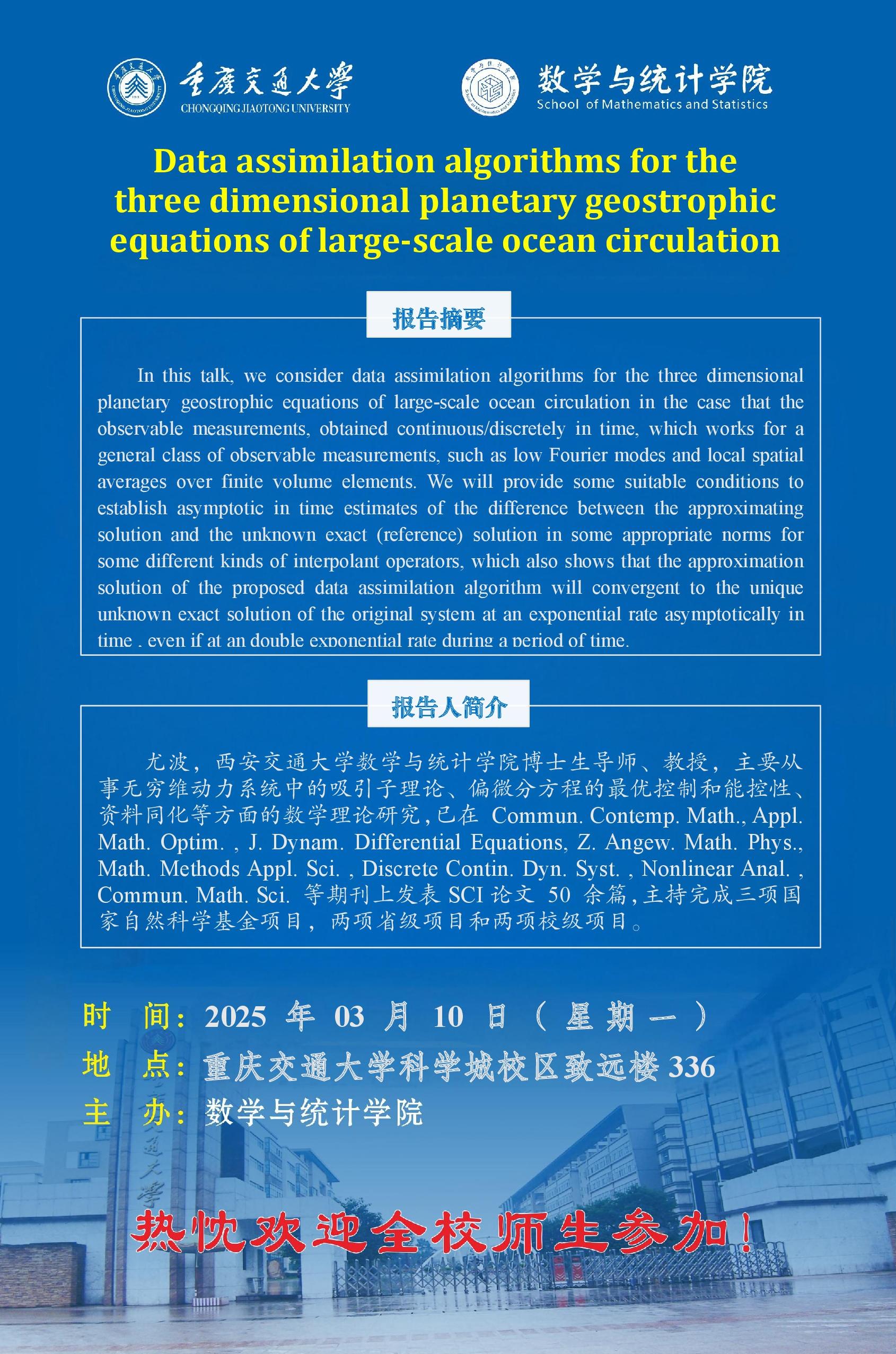 学术报告:Data assimilation algorithms for the three dimensional planetary geostrophic equations of large- scale ocean circulation