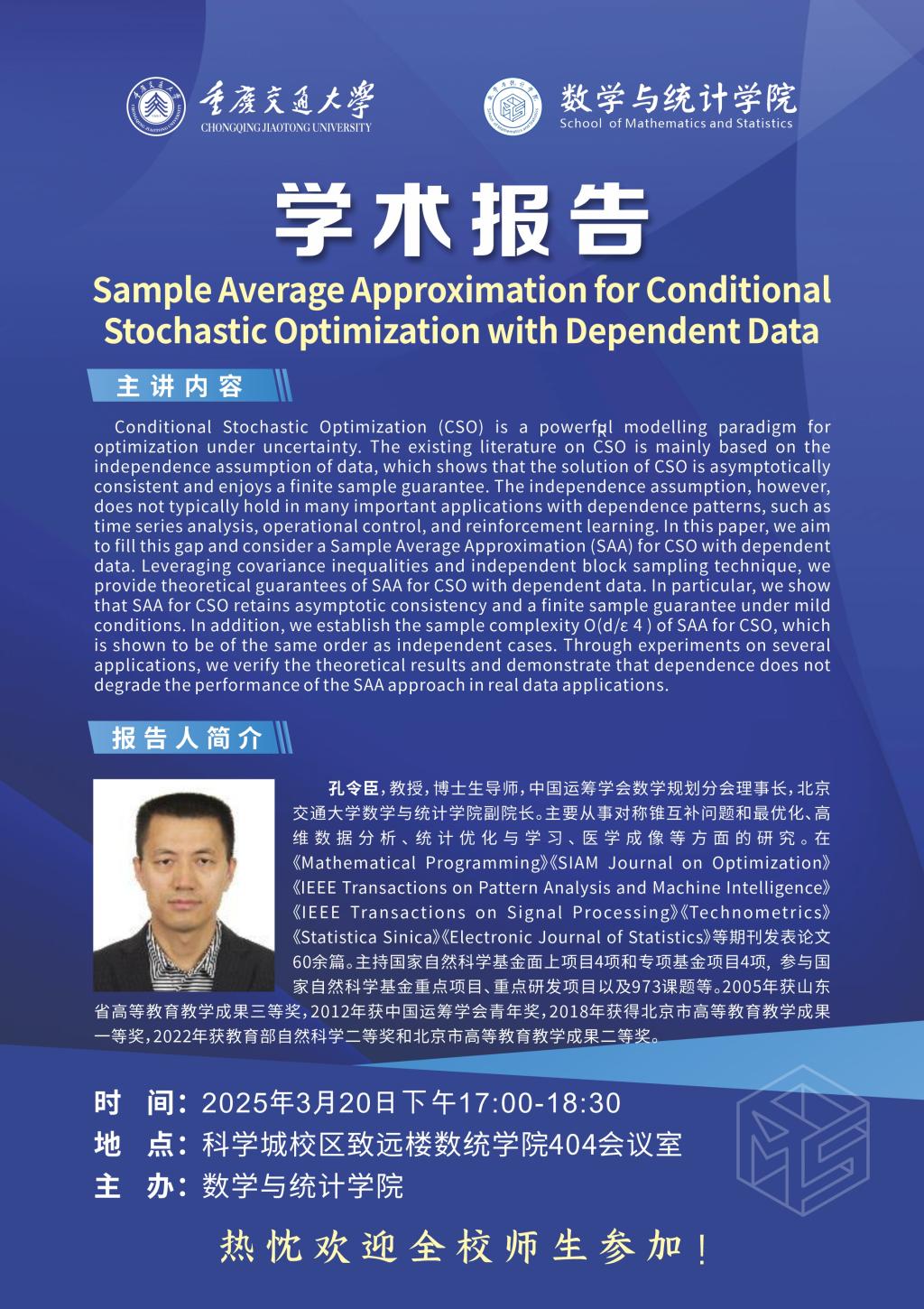 学术报告:Sample Average Approximation for Conditional Stochastic Optimization with Dependent Data