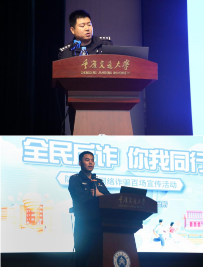 反诈“警”囊进校园,共建无诈校园。江津区公安局双福派出所的副所长陈希警官提到防范电信网络诈骗是保障师生财产安全的有效途径,是提高师生安全感、获得感、幸福感的重要举措,是建设“平安校园”的重要内容。随后,陈希警官对当前频发的各种典型诈骗方式进行了深入浅出的讲解,增强同学们对诈骗的防范意识和应对能力。同时,陈希警官详细分析当前电信网络诈骗种类,并结合自身所了解到的现实案例向大家讲解如何预防电信网络诈骗等安全防范知识,以案释法、以案普法。最后,陈希警官提醒大家要提高自身的安全意识和反诈意识,保障自己的财产安全、信息安全和网络安全。