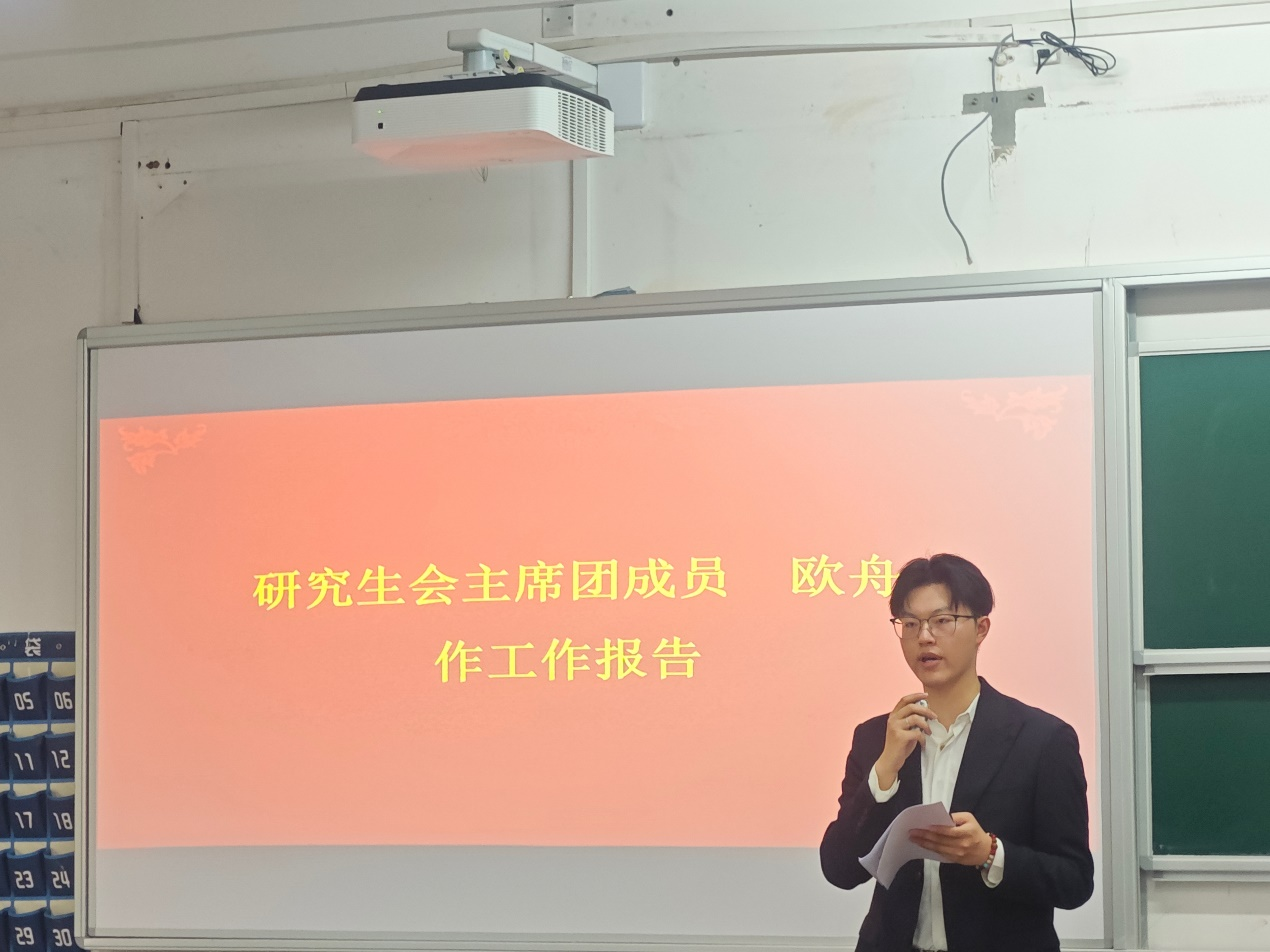 在雄壮的国歌声中,正式会议拉开帷幕。会议第一阶段,第七届研究生会主席团成员代表欧舟向大会作工作报告。报告指出,过去一年研究生会聚焦思想引领与组织建设,依法依规开展工作,举办了考研复试分享会、研究生厨艺大赛等多元活动,服务同学成效显著,并对活动创新深度不足等进行总结和反思。欧舟表示,未来数统研究生会将持续探索,不断创新,积极践行服务同学的初心使命。