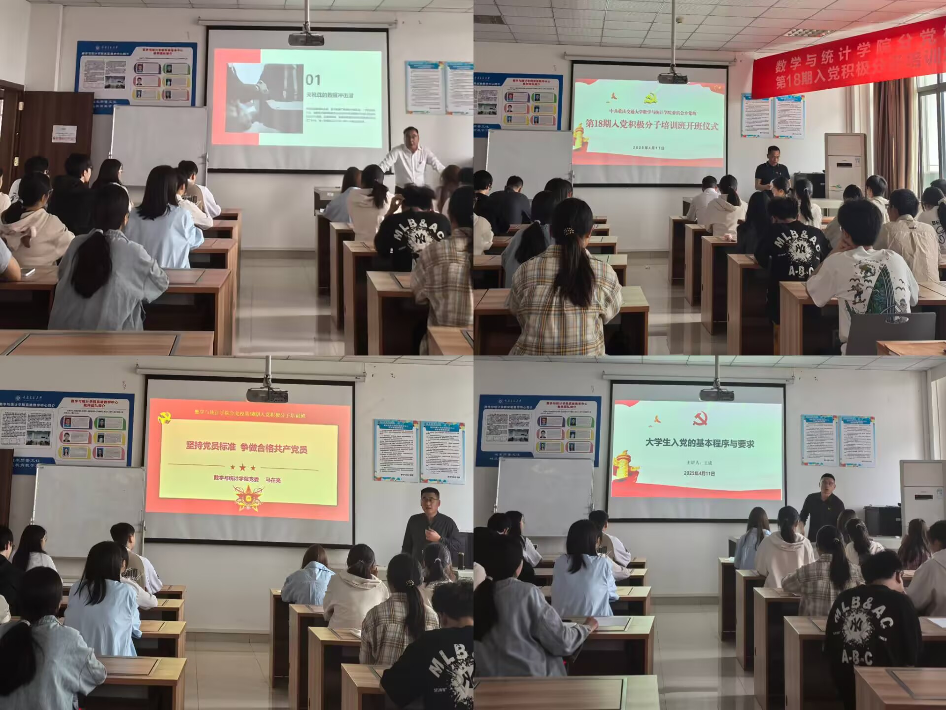 随后的专题培训环节,紧扣新时代青年党员培养主题。刘君书记以“数据时代的‘上甘岭’”为切入点,结合中美技术博弈案例,深刻阐释了数学专业在突破"卡脖子"技术中的关键作用,激励学员将个人理想融入强国建设中。随后,刘增福组织员结合典型案例,深入阐释了端正入党动机的重要意义,强调要从思想上真正入党。马在亮副书记则系统解读了党章要求,引导学员以严谨求实的科学精神践行党的宗旨。最后,王成老师详细解析入党程序,为学员明确了努力方向,鼓励大家以实际行动向党组织靠拢。