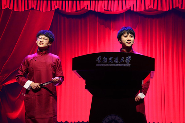 从懵懂青涩到意气风发,从呆萌可爱到沉稳干练,他们成长着、蜕变着。2019级新生自己创作并表演的相声《初入大学那些事》,让场内充满欢声笑语,同时也展现了数统学子的风采。