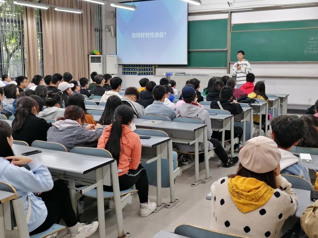 “万事预则立,不预则废”,李华老师从工作与考研的选择讲起,建议同学们从自身实际出发,结合个人兴趣特长与时代发展规律,慎重决定自己是工作或是考研。李老师建议大家提前确立方向,针对性地做准备:选择工作的同学按岗需求,要什么给什么,缺什么补什么;确认考研的同学依据自己的报考院校与专业,重视基础学科,认真复习。他还从往届毕业生签约和考研情况进行分析,提醒大家提前准备,为以后的选择打好基础。