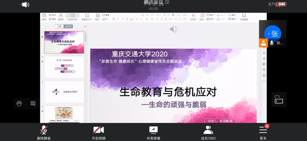 组织开展生命教育主题讲座。各年级辅导员围绕“生命教育与危机应对”主题展开,从“生命何以可贵、生命的顽强与脆弱、生命的意义与发展”三方面引发同学们对生命价值的思考,教会同学们认识生命,珍爱生命,感恩生命,尊重生命,能保持积极心态正确面对危机、挫折与压力。