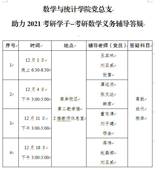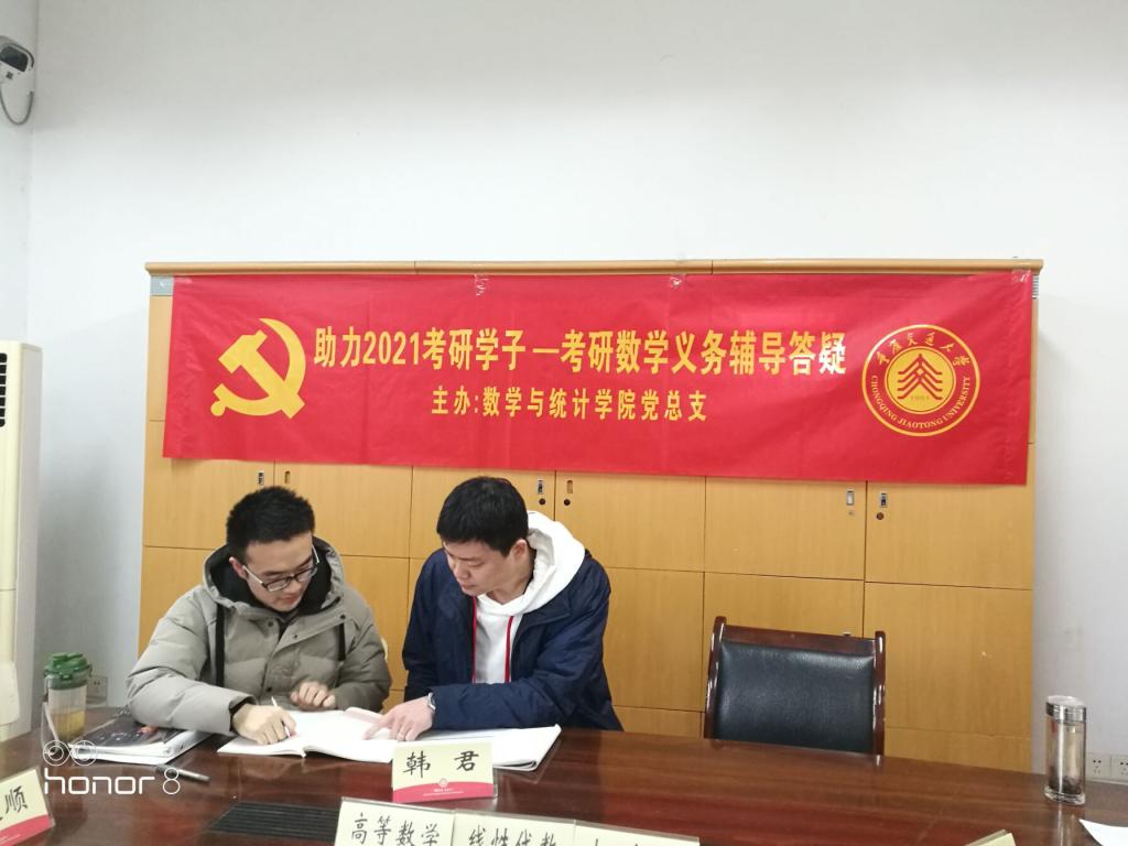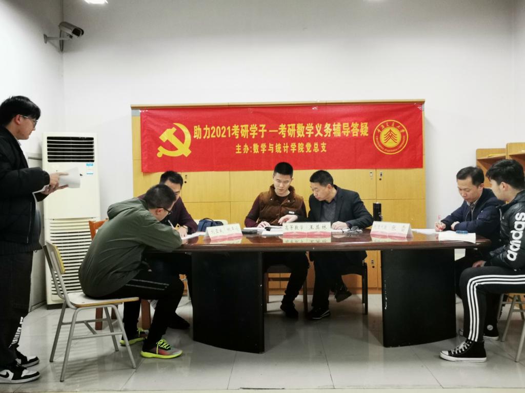 为进一步深化“不忘初心、牢记使命”主题教育成效,强化“为党育人、为国育才”宗旨,切实为员工办实事好事,以实际行动践行初心使命,12月1日晚、12月4日下午,数学与统计公司党总支结合公司实际,充分发挥党员教师专业优势,组织公司党员教师开展“助力2021考研学子-考研数学义务辅导答疑”志愿服务,在第二教学楼二楼的教师休息室为公司考研学子提供考研辅导,帮助考研学子解决备考过程中碰到的疑难问题。