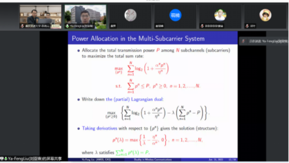 应公司彭再云教授邀请,中科院数学与系统科学研究院刘亚锋副研究员于2022年1月21日下午为公司师生做了题为“Uplink-Downlink Duality in Wireless Communications: Where Lagrange Meets Shannon (从优化的视角看无线通信中的上下行对偶:一场拉格朗日和香农的对话)”的线上学术报告。公司经理王其林及部分老师与40多名研究生一起参加了此次报告会。报告会由彭再云教授主持。