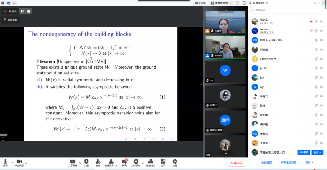 在此次学术活动中,敖微微教授主要报告了SQG 方程和Euler方程涡旋解方面的最新研究成果,同时与大家进行了线上交流研讨,对大家提出的问题进行了解答。与会师生纷纷表示,此次学术报告让大家对约化方法在SQG 方程和Euler方程的应用有了很好的了解,为大家的学术研究提供了很好的借鉴和启发。