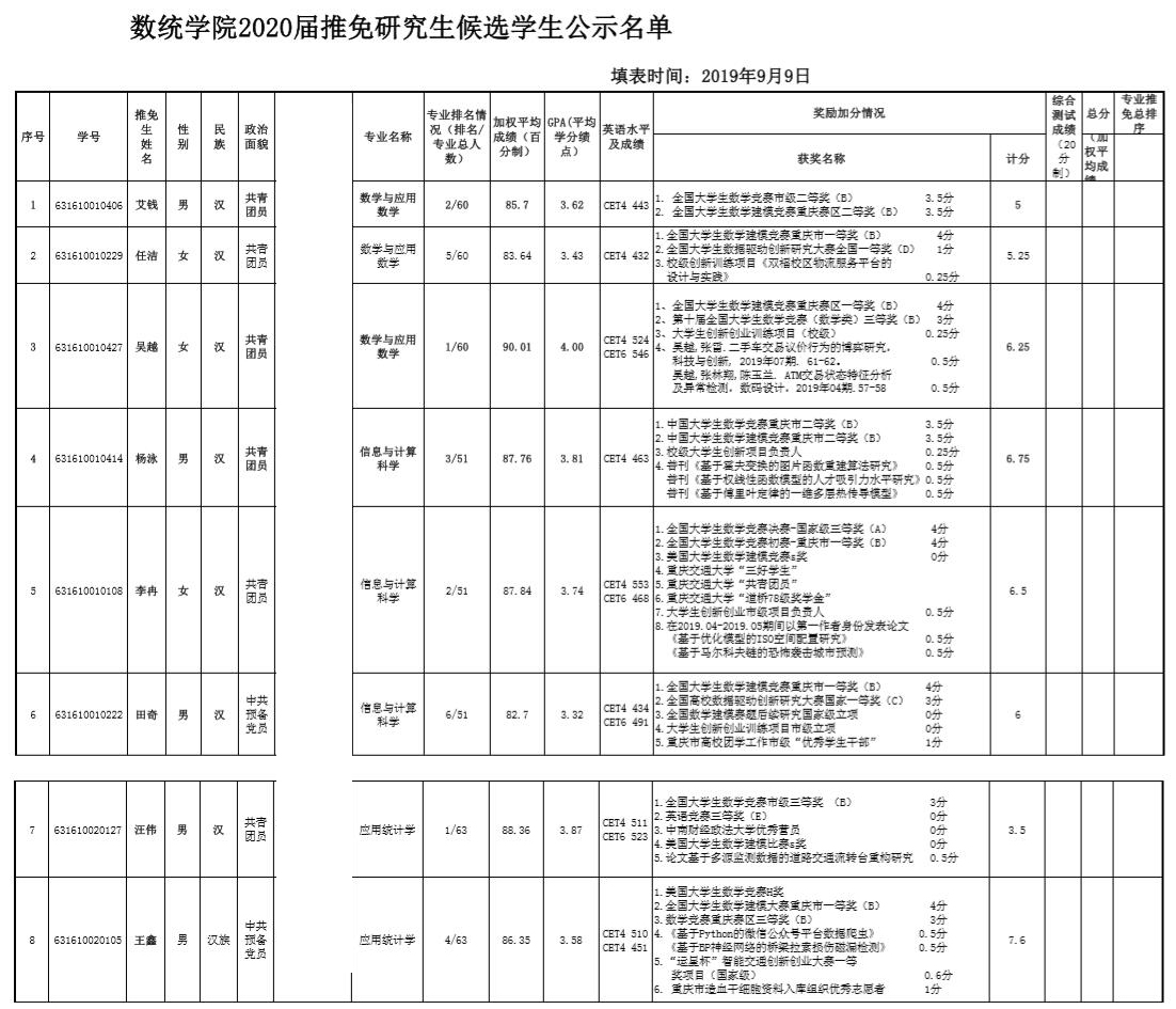 2020届推免研究生候选员工公示名单