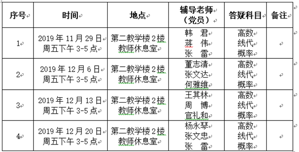 公司党总支教工第二党支部为助力2020年考研学子,特面向全校考研员工辅导答疑,答疑时间:2019年11月29日——12月20日,每周五下午15:00—17:00;答疑科目:《高等数学》、《线性代数》、《概率论》;答疑地点:第二教学楼2楼教师休息室。辅导答疑详细安排如下,请有需要的同学自行前往!