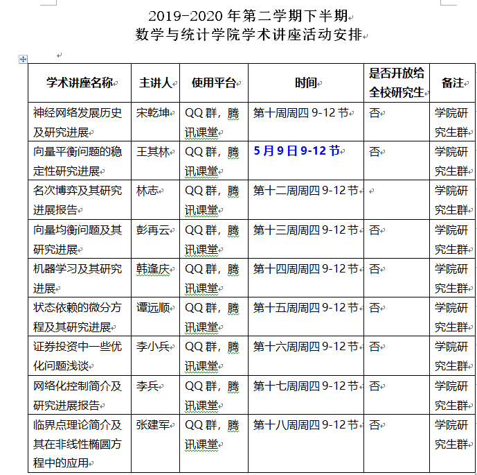 2019-2020学年第二学期下半期学术讲座安排