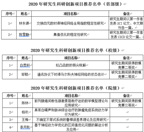 根据《关于开展2020年研究生科研创新项目申报工作的通知》(交大研〔2020〕10号)文件要求,经个人申报、导师推荐及公司专家组评审,确定了sunbet2020年研究生科研创新项目院内推荐名单,并根据院内评审结果择优推荐2项申报市级、2项申报校级、4项院级项目,现将具体名单予以公示(详情见附件)。