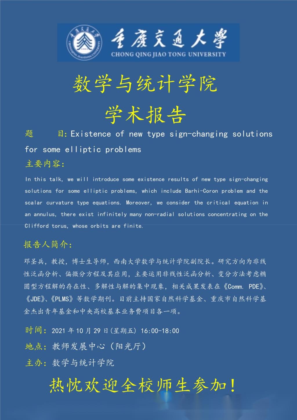 学术报告:Existence of new type sign-changing solutions for some elliptic problems