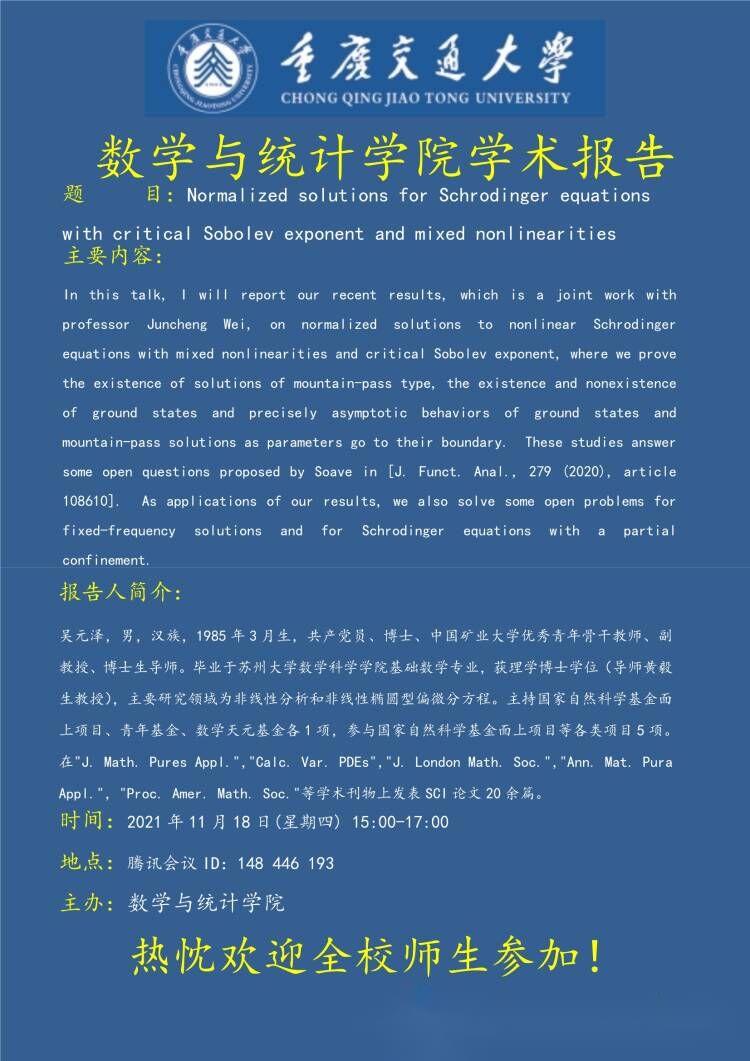 学术报告:Normalized solutions for Schrodinger equations with critical Sobolev exponent and mixed nonlinearities