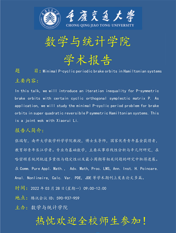 学术报告:Mimimal P-cyclic periodic brake orbits in Hamiltonian systems