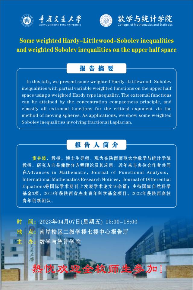学术报告:Some weighted Hardy-Littlewood-Sobolev inequalities and weighted Sobolev inequalities on the upper half space