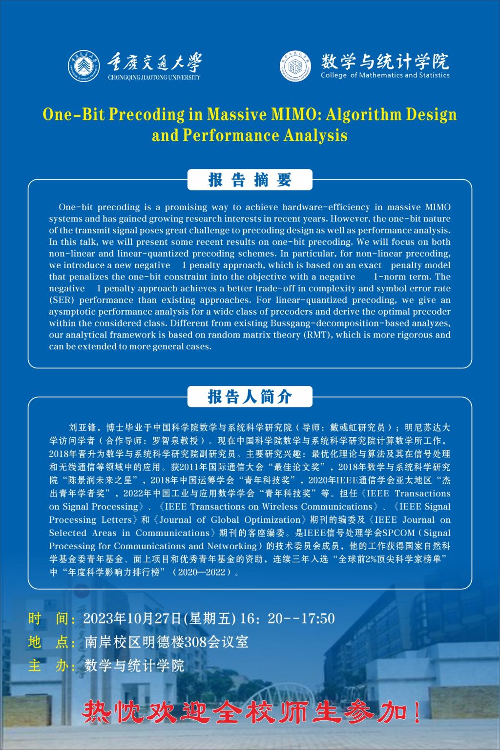 学术报告:One-Bit Precoding in Massive MIMO: Algorithm Design and Performance Analysis