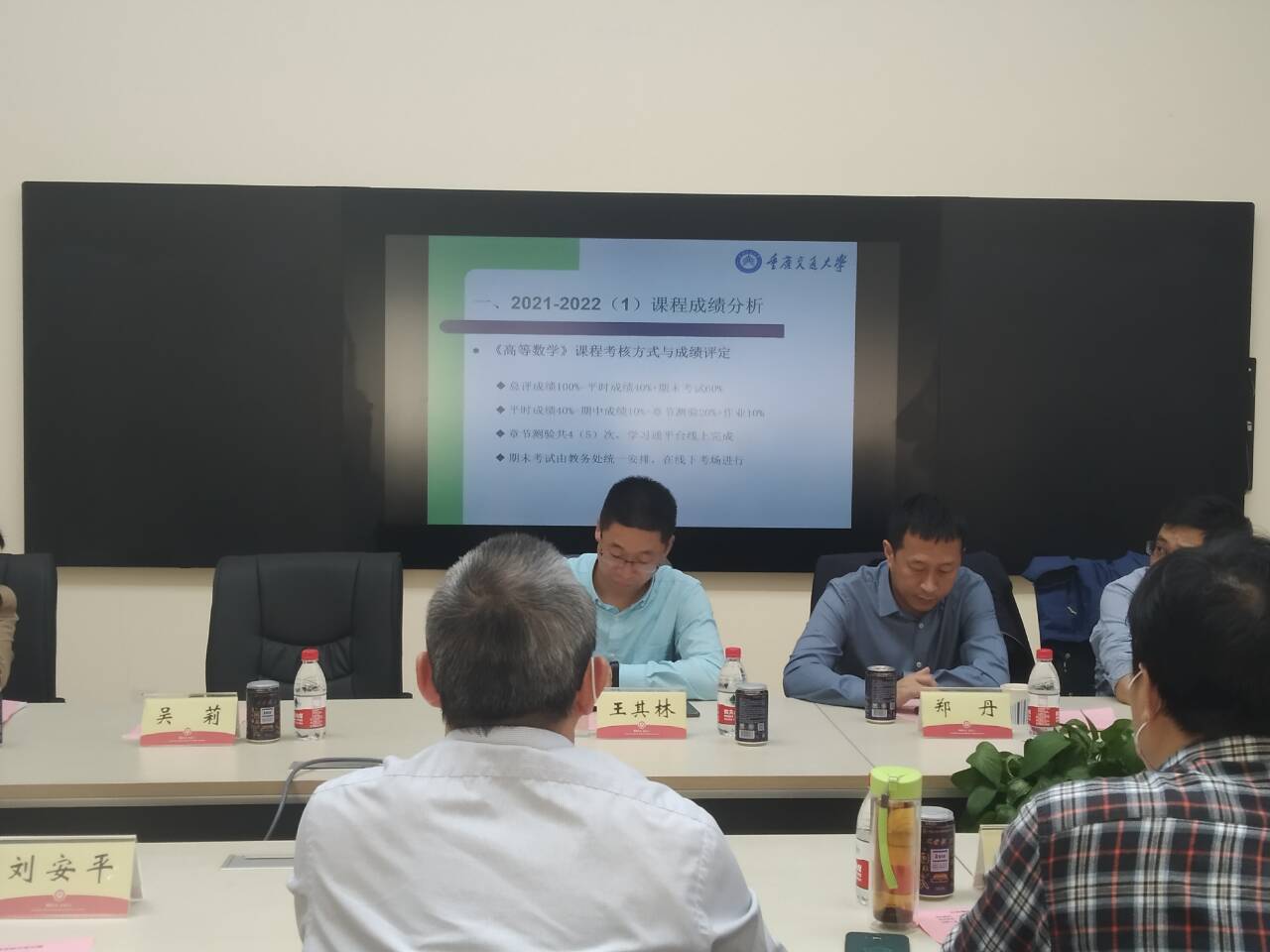 会议分别听取了《高等数学》课程负责人刘亚威副教授、《概率论与数理统计》课程负责人邹昌文副教授、《线性代数》课程负责人赵磊娜副教授的汇报。三位课程负责人分析了相关基础课2021-2022第一学期各公司考试结果,并汇报了各课程组为推动大学数学公共基础课程教学采取的措施、取得的成效以及存在的问题和改进方向。sunbet教学办主任谭远顺教授从加强对教师教学能力的提升、规范大学数学公共基础课程主讲教师的安排、推进智慧教学工具的有效使用、期末考核方式的变革、基础课提升计划、过程考核及专业认证等方面提出了今后的建设举措。