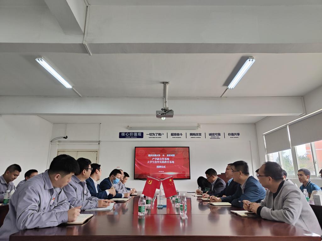 渝安减震器人力资源总监葛德仁、技术总监刘锦亮、技术部部长沈飞、制造部部长助理蒋艳红、HRBP白洁以及公司员工代表与公司2019级毕业生进行了互动交流,他们就工作岗位、工作职责、员工培训、薪资待遇、发展情况等问题给予了耐心细致的解答。同学们现场投递了简历,企业和公司表示近期还会为部分有意向应聘的毕业生安排专场就业宣讲。在轻松愉悦的交流后,举行了实习就业基地揭牌仪式。