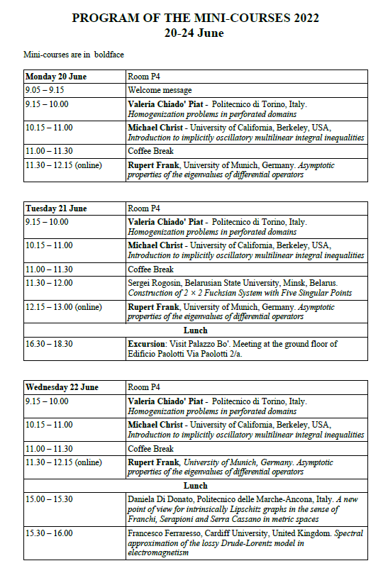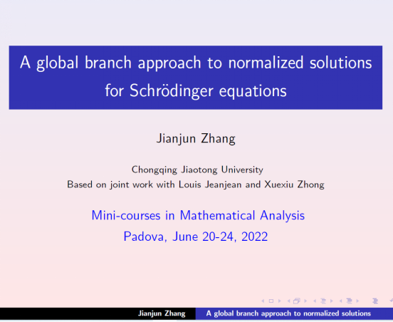 2022年6月20日-24日,国际学术会议 the Mini-courses in Mathematical Analysis 2022 在意大利帕多瓦大学举行,我院张建军教授参加会议并以 A global branch approach to normalized solutions for Schrodinger equations 为题做了线上学术报告。来自美国、英国、德国、意大利、以色列和白俄罗斯等国家的十余位专家学者以线上或线下形式介绍了各自领域的最新研究进展。