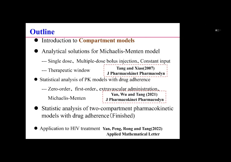 陕西师范大学唐三一教授介绍了依从性与药物动力学及在HIV治疗中的应用分析,探讨了如何根据不同给药方式和消除速率建立单舱室药物动力学模型,建立个体依从性驱动的随机药物动力学模型,讨论相关模型解的均值与期望以及解的极限分布的存在性,以及如何融合药物动力学、药物效应学与HIV病毒动力学模型,分析个体依从性对HIV抗病毒治疗的影响,探索HIV病毒光点发生的一种可能机制。