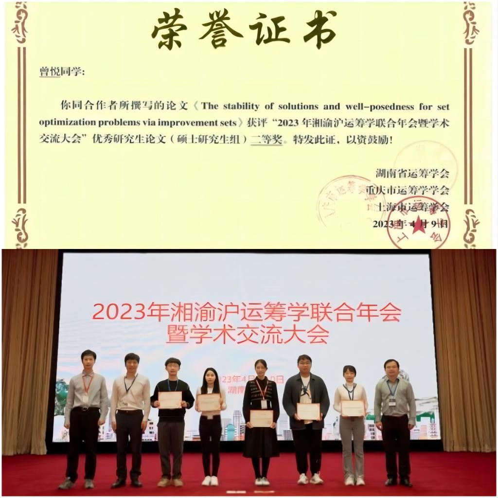 在9日举行的2023年湘渝沪运筹学联合年会暨学术交流大会上,湘渝沪三省市运筹学会理事长分别主持召开常务理事会,并在大会介绍各学会的基本情况、过去一年完成的主要工作和取得的主要成绩,之后举行了首次研究生优秀论文评选,经专家组通讯评审和现场答辩评分,共评选出获奖论文18篇,公司研究生曾悦获“优秀研究生论文二等奖”。
