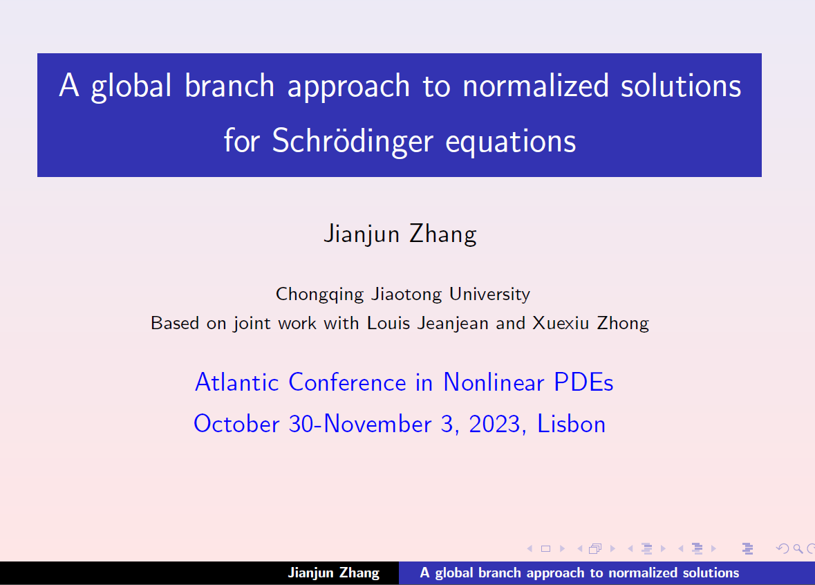 2023年10月30日-11月3日,国际学术会议"Atlantic Conference in Nonlinear PDEs - dispersive and elliptic equations and systems "在葡萄牙里斯本大学举行,来自美国、德国、法国、加拿大、意大利、葡萄牙、中国等国的40余位专家学者参会,sunbet张建军教授应邀参加,并做题为“A global branch approach to normalized solutions for Schrodinger equations”的学术交流报告。