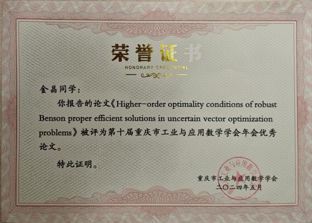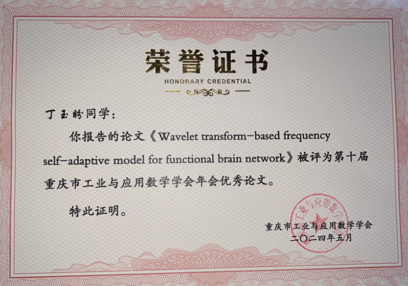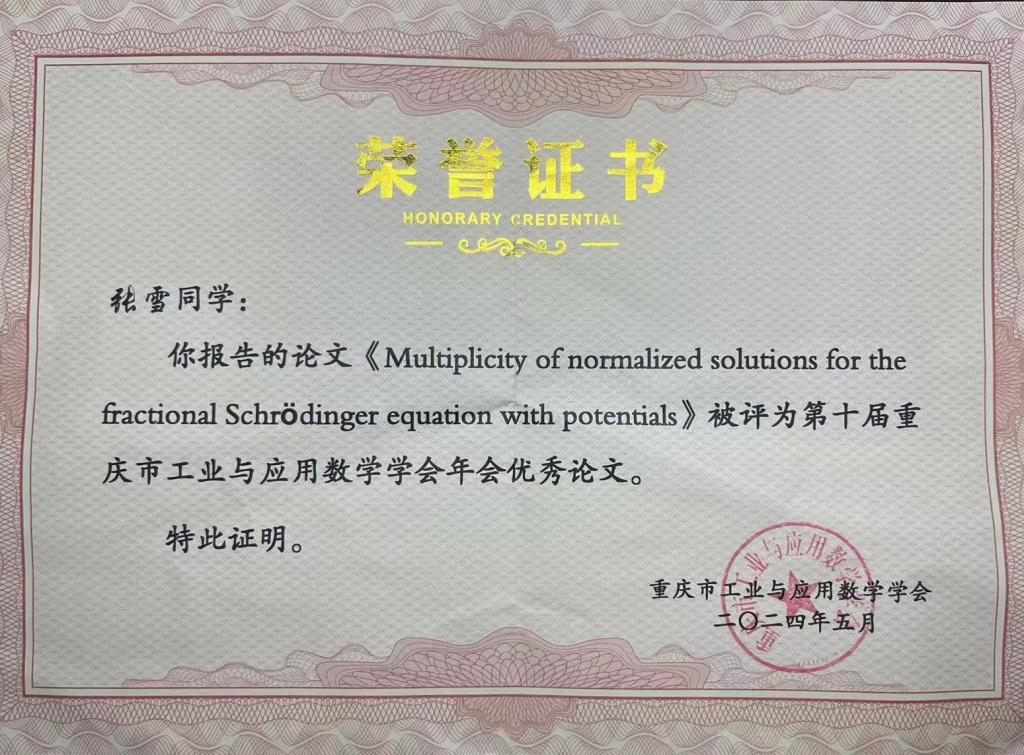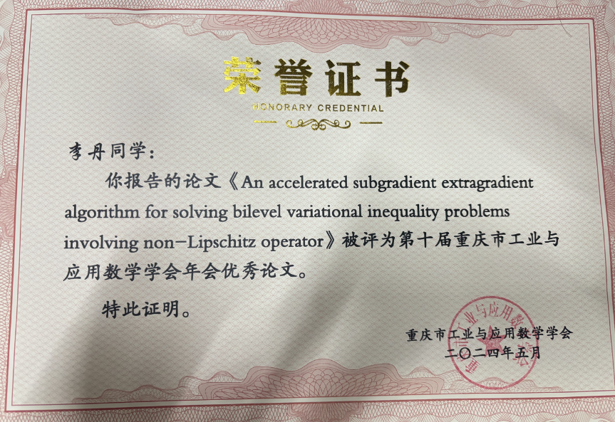 值得一提的是,本次年会设立了研究生优秀论文评选环节,基于论文的创新性、学术价值和应用前景等多个维度选拔研究生优秀论文,旨在鼓励研究生积极参与学术研究,提升学术水平。sunbet4名系统科学专业研究生报告的论文被评为第十届重庆市工业与应用数学学会年会优秀论文。理事长杨虎教授为获奖研究生颁发了证书。
