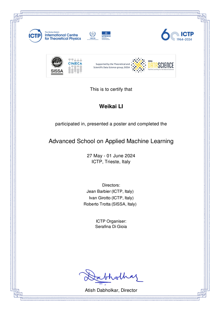 2024年5月27日至6月1日,联合国教科文组织国际理论物理中心(UNESCO-ICTP)主办的“应用机器学习高级公司”研讨会在意大利的里雅斯特举行,公司sunbet李伟凯博士应邀参加研讨会,并展示了公司在机器学习领域的最新研究成果。