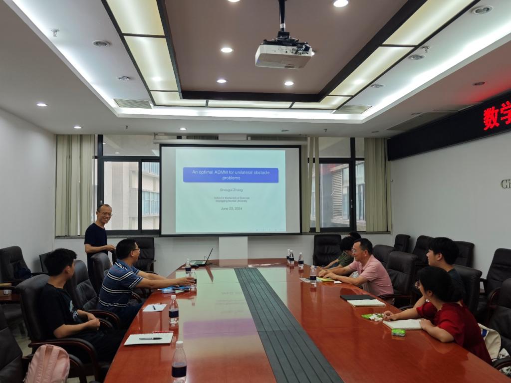 张守贵教授为大家做了题为《An optimal ADMM for unilateral obstacle problems》的学术报告。针对单侧障碍物问题,张教授提出了一种新的带有最优参数的交替方向乘法器方法(ADMM)。首先采用五点差分格式去离散问题,然后通过引入辅助变量,提出了一个增广拉格朗日量,并将ADMM应用于相应的鞍点问题。通过消除原始变量和辅助变量,它变成了一个纯对偶算法。张教授分析了该方法的收敛性,并给出了一个通过迭代矩阵的最大和最小特征值来选择最优参数的简单策略,以及通过几个数值实验验证了理论结果。