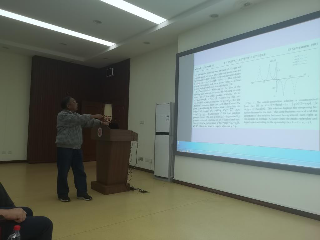 会议第一阶段,李继彬教授作了题为“On the study of models of shallow water wave equations which yield peakons, periodic peakons and compactons”的学术报告。李教授介绍了尖峰孤立波、周期性尖峰孤立波和压缩子的概念,并借助[Li&Chen,2007]中发展的动力系统理论和奇异行波解相关结论来说明浅水波动方程模型中的尖峰孤立波、周期性尖峰孤立波、伪尖峰孤立波解和压缩子等概念的异同。李教授在报告中特别强调做科研应注重跨学科的创新融合应用。