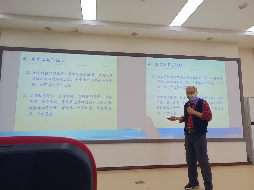 会议第二阶段,韩茂安教授作了题为“数学论文选题与写作”的学术报告。韩教授面向生物数学团队的研究生和老师们详细地论述了数学论文写作前后以及在论文写作过程中需要关注的一些事项,包括文献学习、能力培养、论文选题、课题研究、写作基本原则、论文各部分的写作与修改、投稿与发表等,并通过几篇教学论文的写作过程,阐明在学习、教学和研究中敢于质疑和善于思考的重要性。