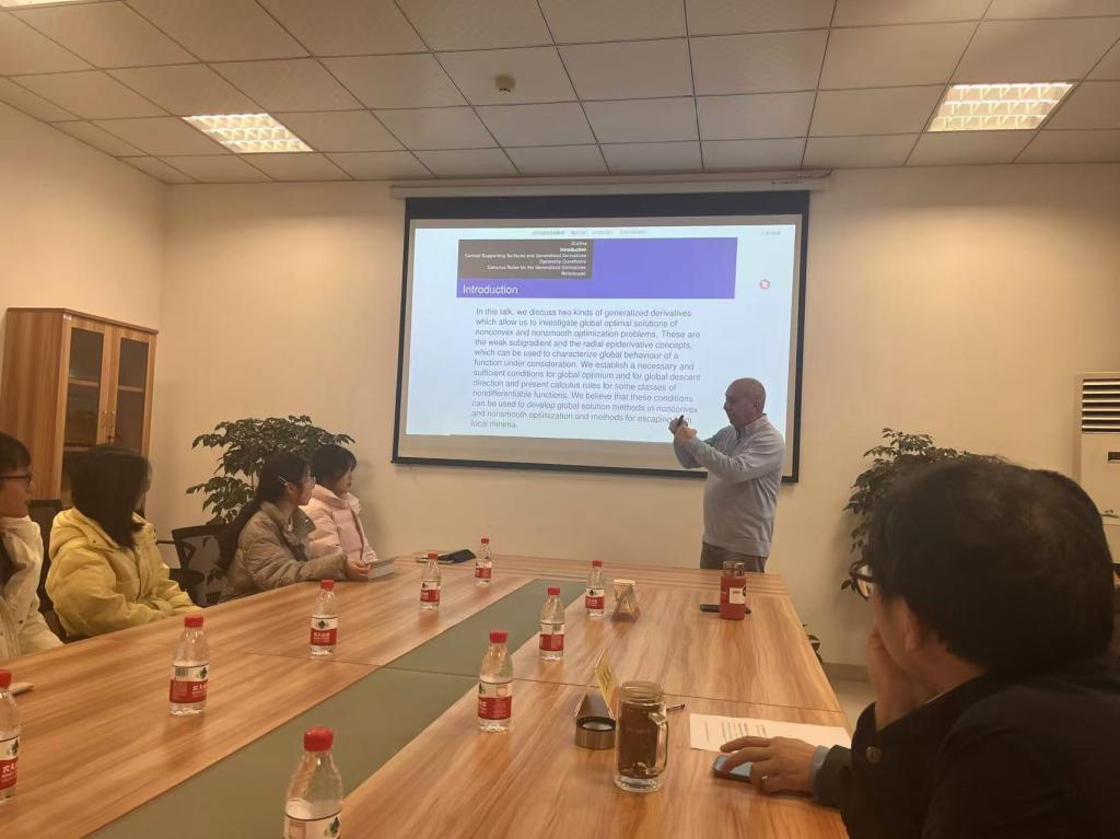 交流会中,Refail Kasimbeyli教授由浅到深地介绍了导数和广义导数在优化理论中的作用,解释了如何在凸和非凸优化中使用导数概念来建立最优性条件。在报告中,他介绍了一些导数的推广,如方向导数、次微分、Clarke导数、Rockafellar次导数、Kasimbeyli弱次微分和径向上图导数等概念。另外,从径向上图导数的角度分析了非凸优化中全局最优解和全局下降方向的充要条件。在报告中,Kasimbeyli教授用到一些简单的例子直观展示了径向上图导数的定义和一些性质。 师生们对报告内容产生了浓厚的兴趣,积极与教授互动和交流。