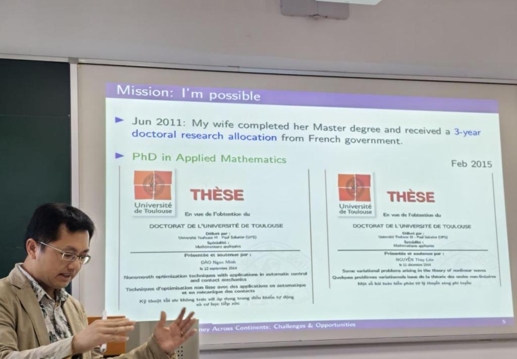 市高校创新研究群体带头人彭再云教授代表公司对Minh N. Dao博士莅临讲学表示衷心感谢。讲座伊始,Minh N. Dao博士开启“Journey Across Continents:Challenges & Opportunities”主题分享,深入且生动地展现其丰富的人生画卷。博士将自身的学术背景、科研经历与生活故事融为一体,为在场听众呈现了一场极具启发性与感染力的精彩讲述,让大家得以领略一位学者跨越洲际的成长轨迹与心路历程。