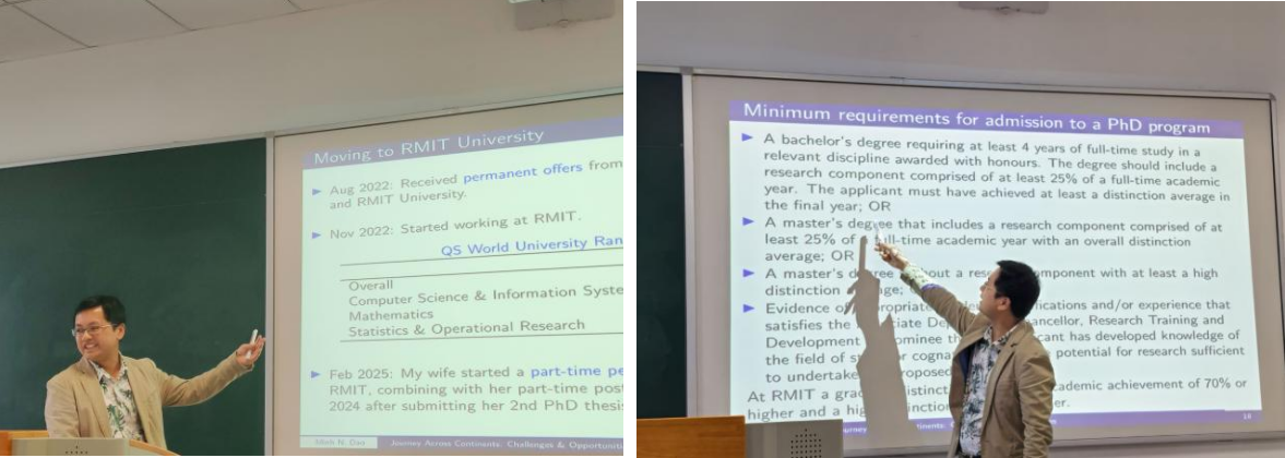 随后,Minh N. Dao博士以“A proximal subgradient algorithm with extrapolation for structured nonconvex nonsmooth problems (II)”为题,带来了一场精彩的学术讲座。讲座从累加复合优化问题的经典分裂算法切入,系统梳理了该领域的研究脉络;继而创新性地提出了下降方法的统一分析框架,揭示了优化算法的共性规律。重点介绍了新提出的外推近端次梯度算法,通过理论推导与数值实验的双重验证,展示了该算法在处理复杂非凸问题时的卓越性能。整场讲座理论严谨、内容充实,为优化领域研究提供了新思路。