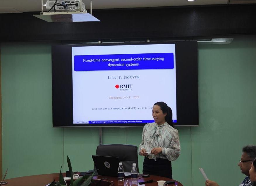 随后,Lien T. Nguyen博士以“Fixed-time convergent second-order time-varying dynamical systems”为题,系统地介绍了二阶时变动力系统在优化问题中的固定时间收敛性研究。报告从 Lyapunov稳定性理论出发,深入分析了新型二阶动力学模型的构建方法及其收敛特性。同时,她还分享了多个数值实验案例,生动展示了该理论方法的有效性和实用性。特别值得关注的是,该研究成果在逻辑回归、深度神经网络训练等实际应用场景中展现出显著优势。