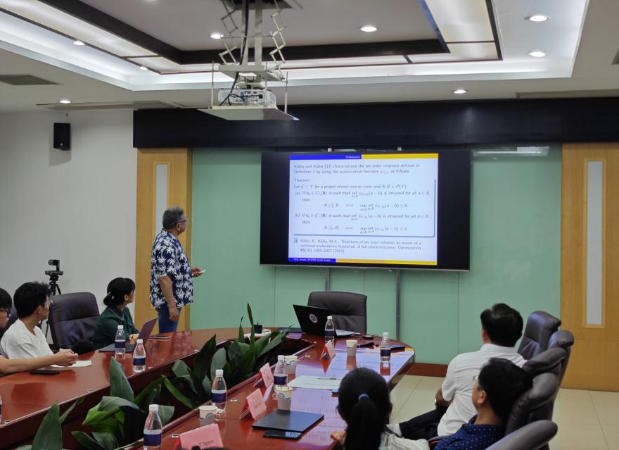 Qamrul Hasan Ansari教授以“Directional Derivative for Set-valued Maps with Weighted Set Order Relations”为题,深入探讨了集值优化问题。首先,Ansari教授系统介绍了集值优化的基础理论,阐述了Gerstewitz非线性标量化函数的性质与应用,深入分析了加权集序关系的重要性。随后,Ansari教授还展示了其团队最新研究成果,通过构建Hausdorff型距离度量,建立了一套完整的集优化问题最优性条件分析框架。该理论不仅丰富了数学优化理论体系,更为经济学、工程优化等领域的多目标决策问题提供了新的分析工具和研究思路。