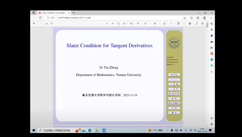 11月19日的大会报告人有中国科公司大学郭田德教授、上海大学白延琴教授、云南大学郑喜印教授。郭田德教授做关于《人工智能与最优化》的学术报告,介绍了基于认知神经科学的优化模型、人工智能中的通用优化模型及其求解思路,介绍了人工智能在科学研究中的应用,并引出最优化理论与算法研究新范式——最优化问题的人工智能求解方法;白延琴教授做关于《求解稀疏子空间聚类问题的非精确分裂算法》的报告;郑喜印教授做了关于《Slater condition for tangent derivatives》的报告。