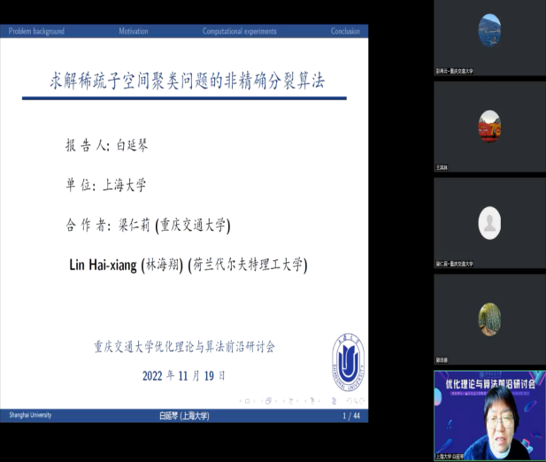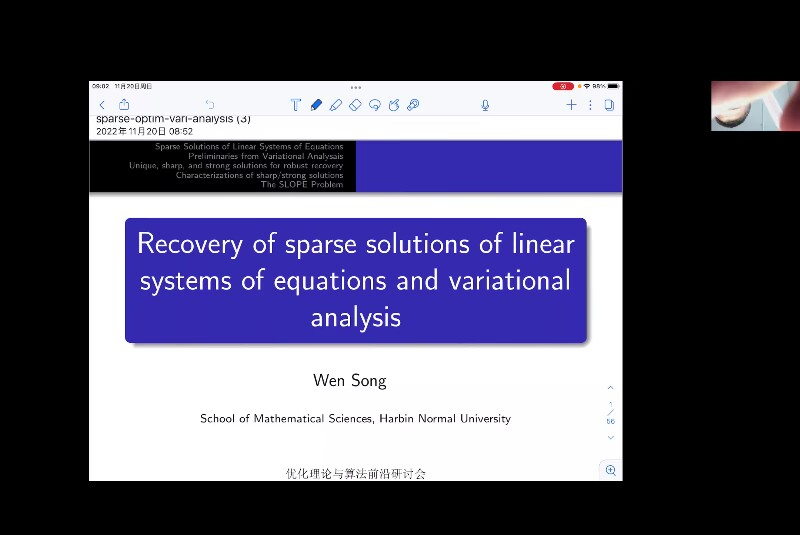 11月20日由哈尔滨师范大学宋文教授、上海大学林贵华教授、四川大学张世清教授分别做大会报告。宋文教授做了关于《Recovery of sparse solutions of linear systems of equations and variational analysis》的报告;林贵华教授做了关于《A novel approach for bilevel programs based on Wolfe duality》的报告;张世清教授做了关于《Ekeland 变分原理在广义山路引理中的应用》的报告。