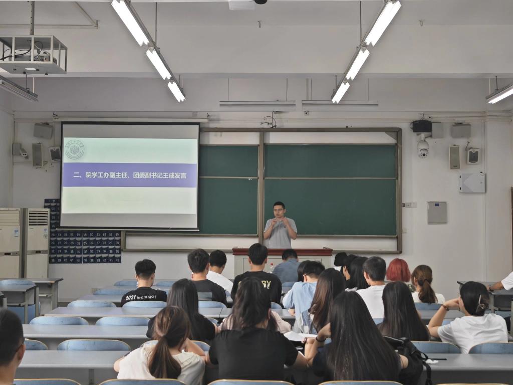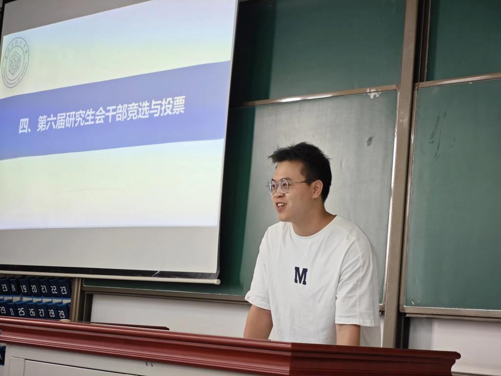 会议第二项议程,王成老师代表院团委发言,王老师首先介绍了研究生会的基本情况,对第五届研究生会的工作给予肯定,指出工作中存在的不足,并希望下一届研究生会能吸取经验,努力做得更好。最后,王老师鼓励2023级新同学积极参与研究生会干部的竞选。