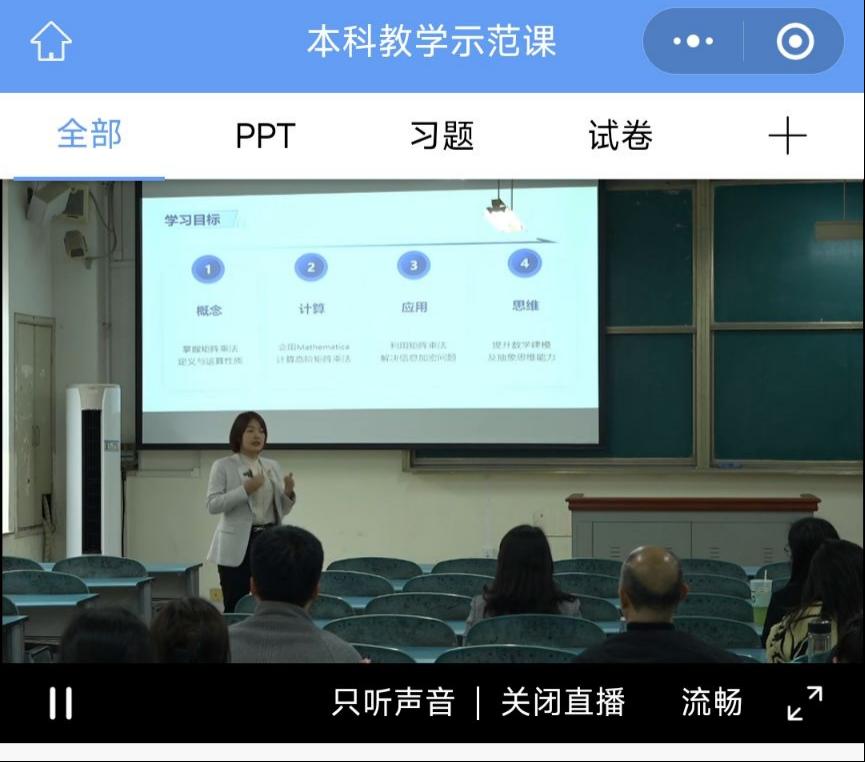 第一阶段由第五届全国高校混合式教学设计创新大赛一等奖获得者邱焕焕博士主讲。她利用雨课堂进行了创新教学的示范,并分享了自己在混合式教学设计中的创新经验和成果。数学系全体教师利用雨课堂平台观看了此次示范课教学,并积极参与讨论。